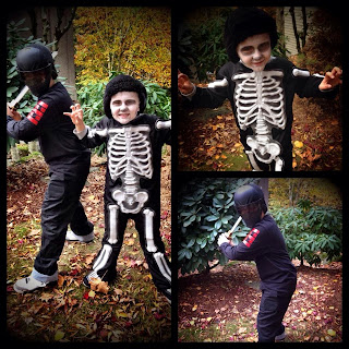 My youngest (age 7) went as a skeleton. He didn't like his mask either, so I did his make-up.